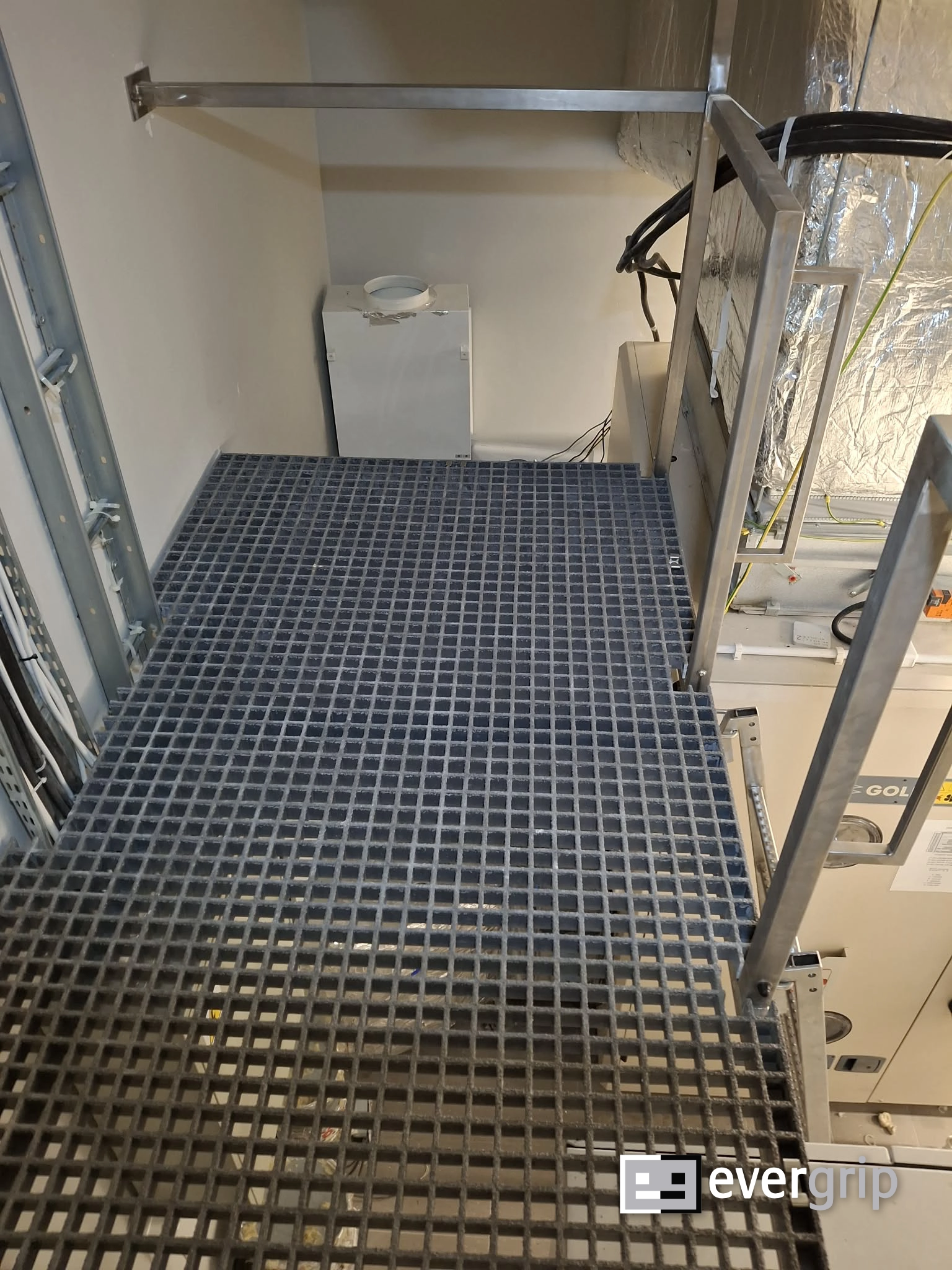 Rozwiązaniem było zaprojektowanie i wykonanie konstrukcji podwieszanej do sufitu, która umożliwia bezpieczny dostęp serwisowy bez ingerencji w istniejącą infrastrukturę. W projekcie połączyliśmy profile kompozytowe GRP, stal nierdzewną oraz sklejkę antypoślizgową filmowaną fenolowo.